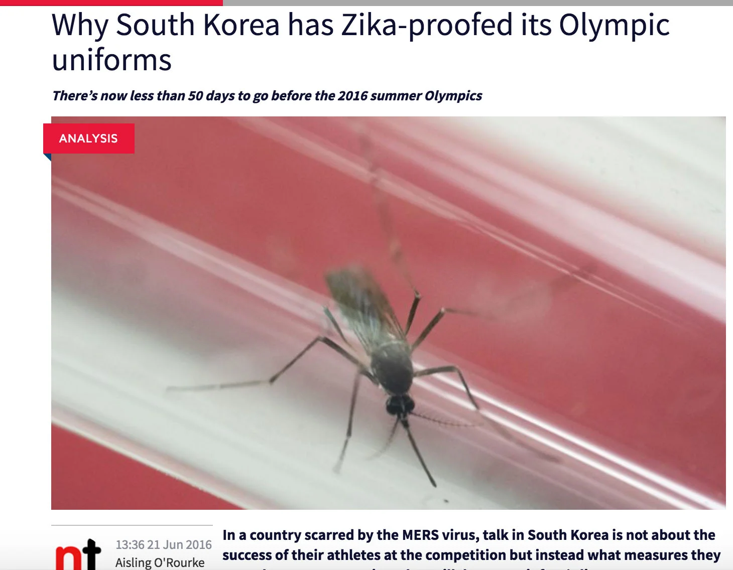 With its birth rate declining over recent years, the protection of family and its continuation, is vitally important in South Korea. According to a report by the Macquarie Securities Group, the proportion of people aged 40 years old and younger plummeted to 48.1% in 2015 compared to 69.4% in 1995. It’s predicted that by 2045, if the situation doesn’t change, South Korea will have the oldest population in the world. Hence South Korea has become the first country to ‘Zika proof’ their uniforms ahead of the Olympic games this August.